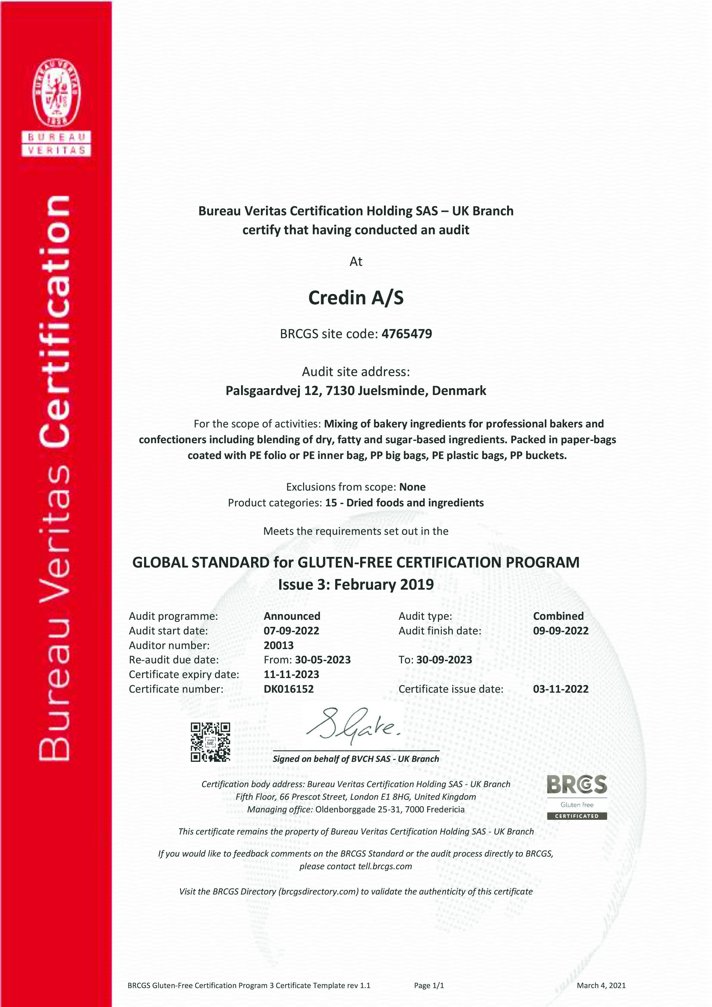 BRCGS glutenfri certificeret efter gluten-free certification program issue 3. Det betyder at alle vores glutenfri produkter lever op til høje styringskrav og indeholder max 20 ppm gluten. Det åbner op for, at vores kunder kan ansøge om tilladelse til at tilføje Crossed Grain-symbolet på deres emballager. Crossed Grain er et frivilligt mærke og det mest anerkendte glutenfrie-symbol i Europa.