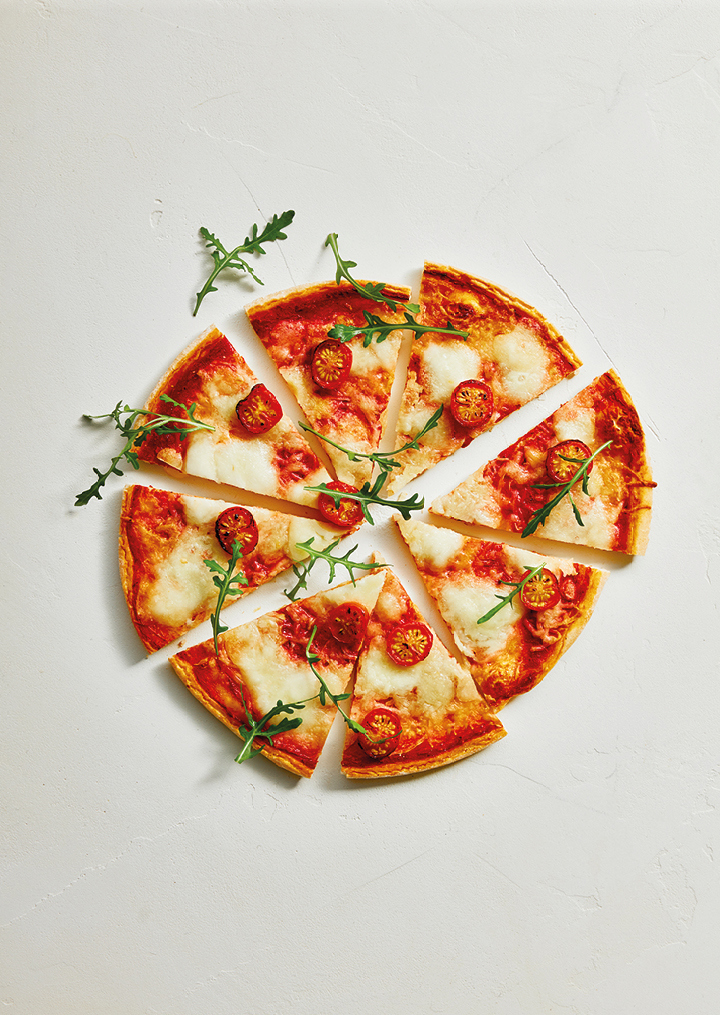 Tilføj din favorit tomatsauce og topping for en pizza efter din smag.