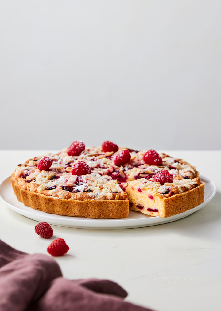 Denne smagfulde kage består af en sprød linsebund, saftig og blød kage, flot afpyntet med friske bær og sød crumble. Den er nem at bage, da kagen er baseret på én glutenfri kagebase.