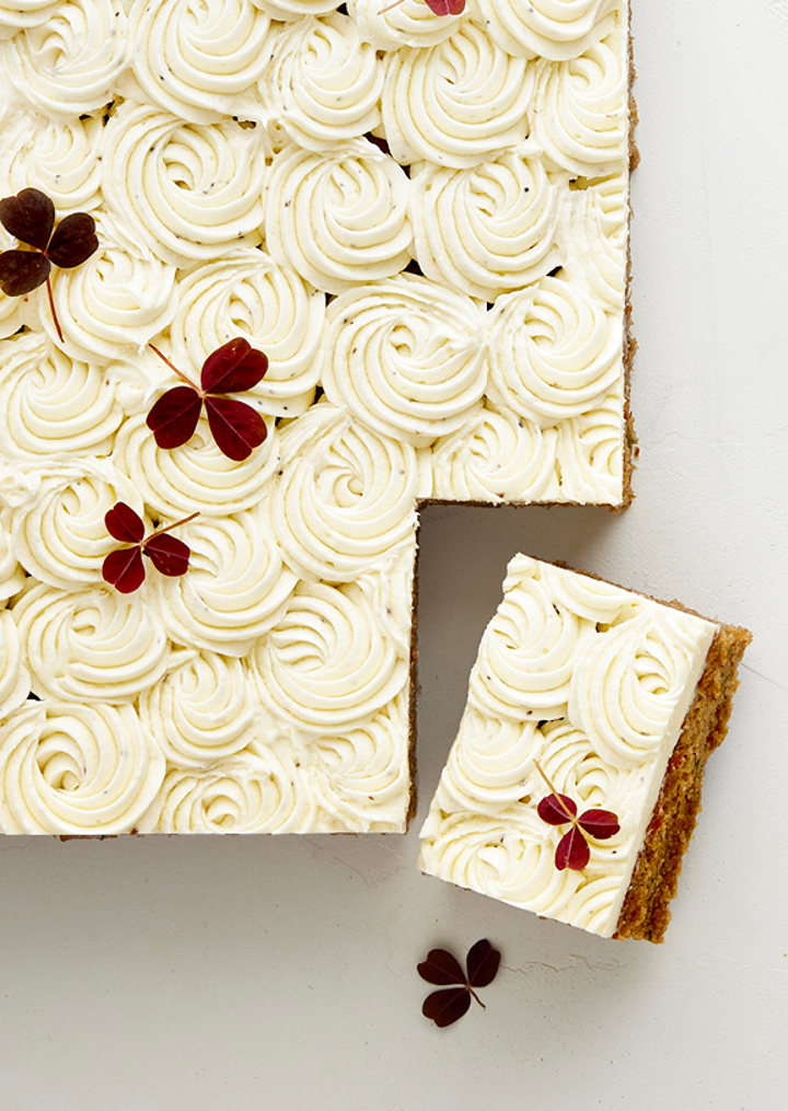 Flødeostglasur fyldes i en sprøjtepose med stjernetyl og der sprøjtes små rosetter i forskellige størrelser. Pynt med ristede nødder og lidt skovsyre.